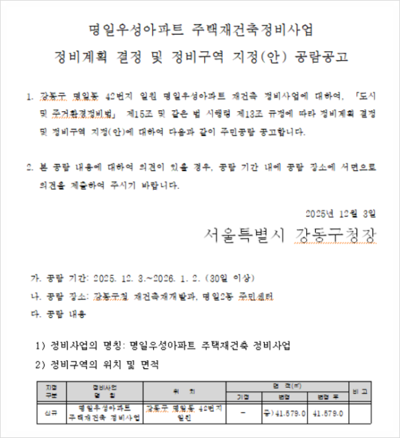 명일동은 강동구 고덕동, 상일동과 함께 신축으로 태어날 재건축 단지가 많은 곳이다. 흔히 말하는 명일동 재건축 4인방인 명일한양, 명일우성, 명일신동아, 삼익그린2차 중 하나이다. 정비업계에 따르면 부동산 상승기와 함께 가장 속도가 느렸던 명일우성 역시 정비구역 지정공람이 끝나고 재건축이 시작된다. 명일우성은 21년 6월 정밀안전진단에 통과하고 23년 적정성 검토 생략결정으로 재건축이 확정되었다. 두차례의 신속통합기획 자문을 거친 뒤 정비구역 지정 공람이 끝났다.