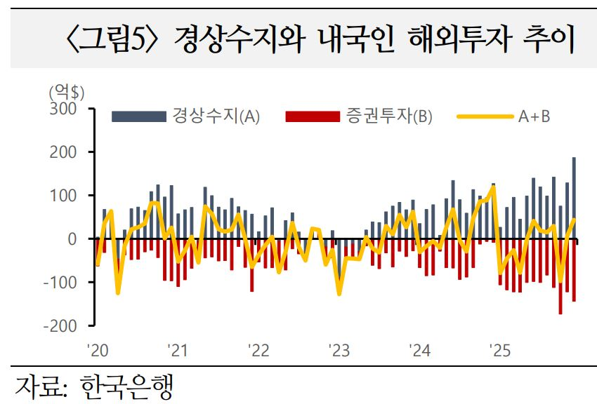 ㅇ 다만 `25년 내국인의 대규모 해외 증권투자 등으로 증권자금 순유출($877.3억)이 확대되었 으며,`26.1월에도 개인들은 순유출($48억)을 지속하는 등 대규모 해외투자가 이어지는 조짐