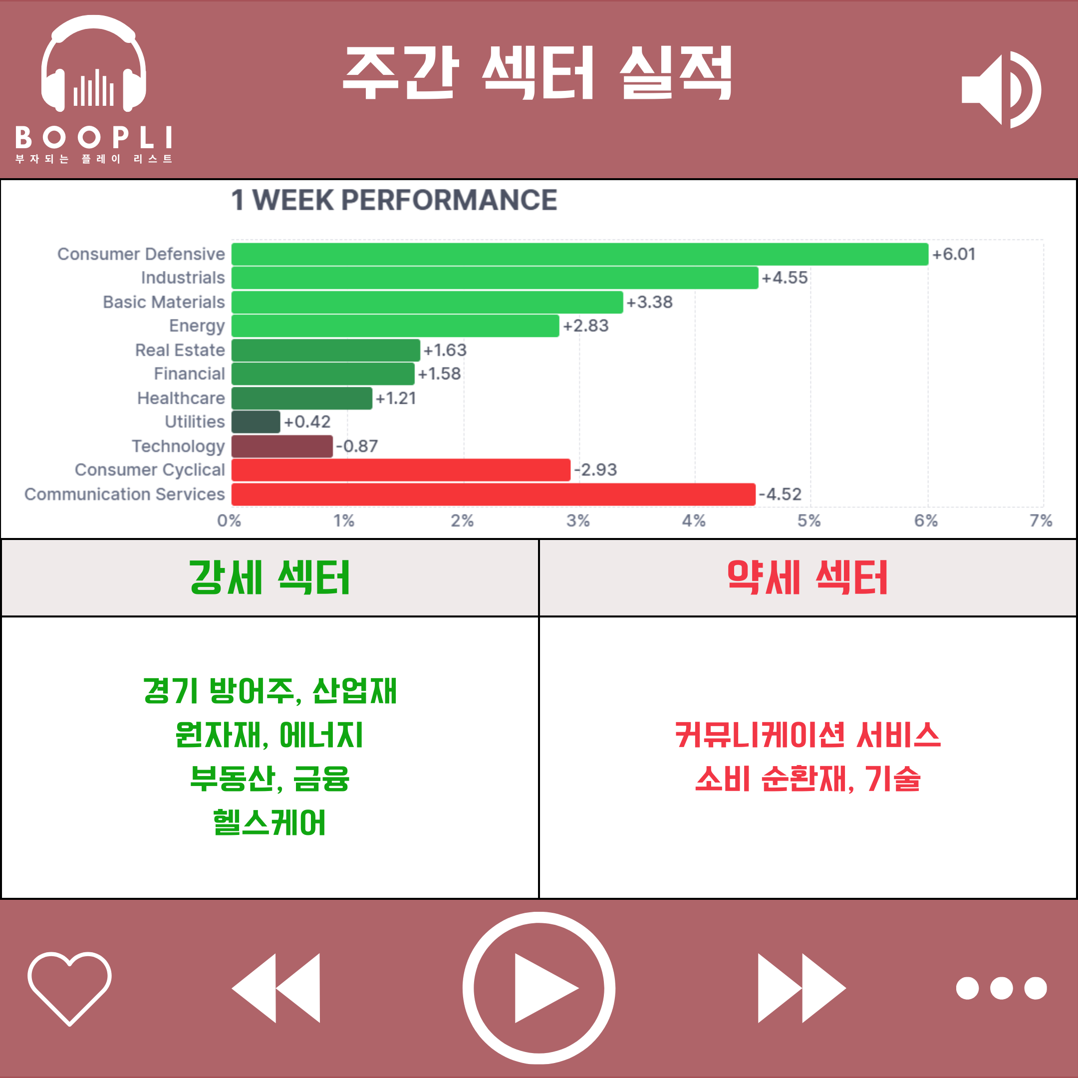 이번 주에는 중동 리스크와 고용 둔화 속에서 경기 방어주가 상승을 주도했고, 이어서 산업재, 원자재, 에너지, 부동산, 금융, 헬스케어 순으로 강세를 보였다.