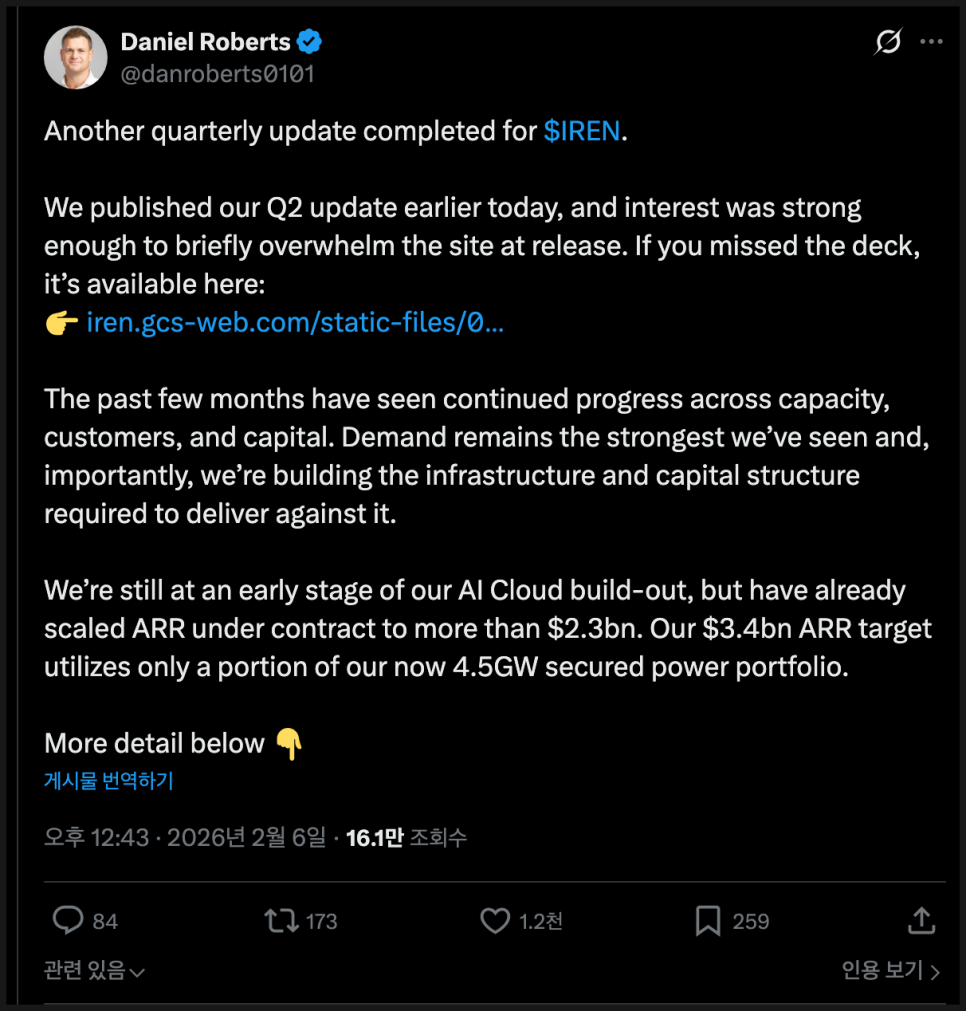 다만 앞서 말씀 드렸듯이 아이렌의 현재 투자 논리는 비트코인이 아니라 AI입니다. 실적 발표 이후 다니엘 로버츠 최고경영자는 X를 통해전했듯이, 투자자와 업계의 시선은 아이렌이 현재 AI 클라우드 인프라 시장에서 차지하고 있는 위치와 향후 성장 가능성에 집중되어 있습니다. 2분기 실적 자료가 공개되자마자 사이트 접속이 일시적으로 과부하가 걸릴 정도로 관심이 집중됐다고 합니다.
