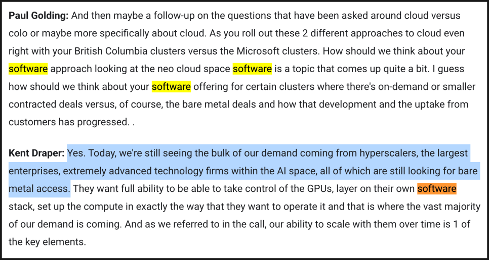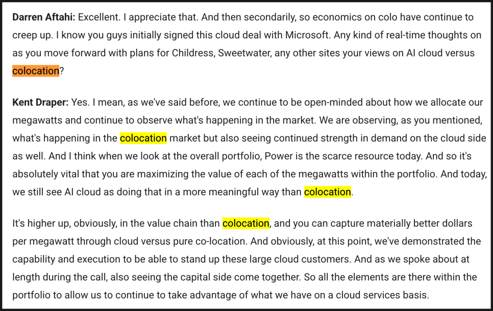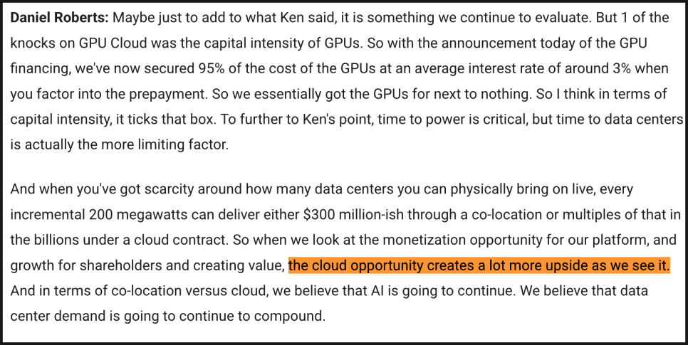 다음으로 투자자들의 관심이 집중된 부분은 AI 클라우드와 콜로케이션(colocation) 중 어디에 더 무게를 둘 것인가였습니다. 콜로케이션이란 데이터센터 운영사가 전력과 공간, 냉각 설비를 제공하고, 고객은 자신의 서버나 장비를 직접 설치해 사용하는 형태의 서비스로, 운영사는 비교적 안정적인 임대 수익을 얻는 구조인데요. 최근 콜로케이션 가격이 상승하고 있다는 점을 감안할 때, 전략 변경 가능성을 묻는 질문이 이어졌습니다. 이에 대해 회사는 현재 기준에서는 AI 클라우드가 전력 메가와트당 창출할 수 있는 가치가 훨씬 크다고 설명했습니다. 콜로케이션은 안정적이지만 수익 구조상 일종의 장기 채권에 가까운 성격을 띠는 반면, AI 클라우드는 훨씬 높은 수익 잠재력을 갖고 있다는 설명이었습니다.