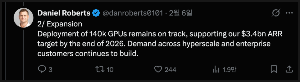 현재까지 14만 개 GPU 배치가 계획대로 진행 중이며, 이를 통해 2026년 말까지 34억 달러 ARR 목표를 달성할 수 있다는 점을 재확인했습니다. 경영진은 이러한 자금 구조가 단순히 기존 계약 이행을 위한 것에 그치지 않고, 추가적인 고객 협상을 진전시키는 데 중요한 역할을 하고 있다고 설명했는데요. 현재 신규 GPU뿐만 아니라 이전 세대 GPU에 대해서도 다수의 계약 협상과 고도화된 논의가 동시에 진행 중이며, 고객 수요 자체는 전혀 부족하지 않은 상황이라고 밝혔습니다.