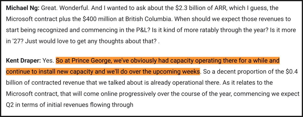 ARR, 즉 연간 반복 매출의 실현 시점에 대한 질문도 나왔습니다. 프린스조지 지역의 경우 이미 상당 부분이 가동 중이며, 4억 달러 수준의 계약 매출은 점진적으로 손익계산서에 반영되고 있다고 설명했습니다. 마이크로소프트 계약 역시 연중에 걸쳐 단계적으로 가동되며, 초기 매출은 2분기부터 인식될 것으로 예상된다고 밝혔습니다.