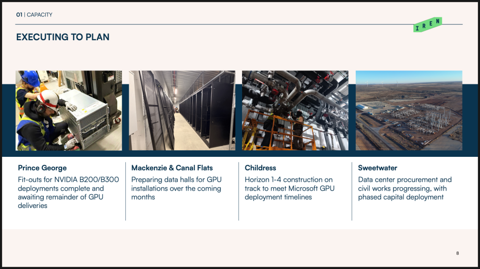 캐나다 브리티시컬럼비아 지역에 대해서는 보다 구체적인 현황을 공유했는데, 프린스조지(Prince George) 데이터센터에서는 이미 약 5억 달러에 가까운 ARR이 계약된 상태이며, 추가 계약도 조만간 마무리될 가능성이 크다고 언급했습니다. 또한 엔비디아(NVIDIA) B200과 B300 GPU를 위한 내부 설비 구축이 완료됐으며, 현재는 남은 GPU 배송을 기다리는 단계라고 밝혔습니다.