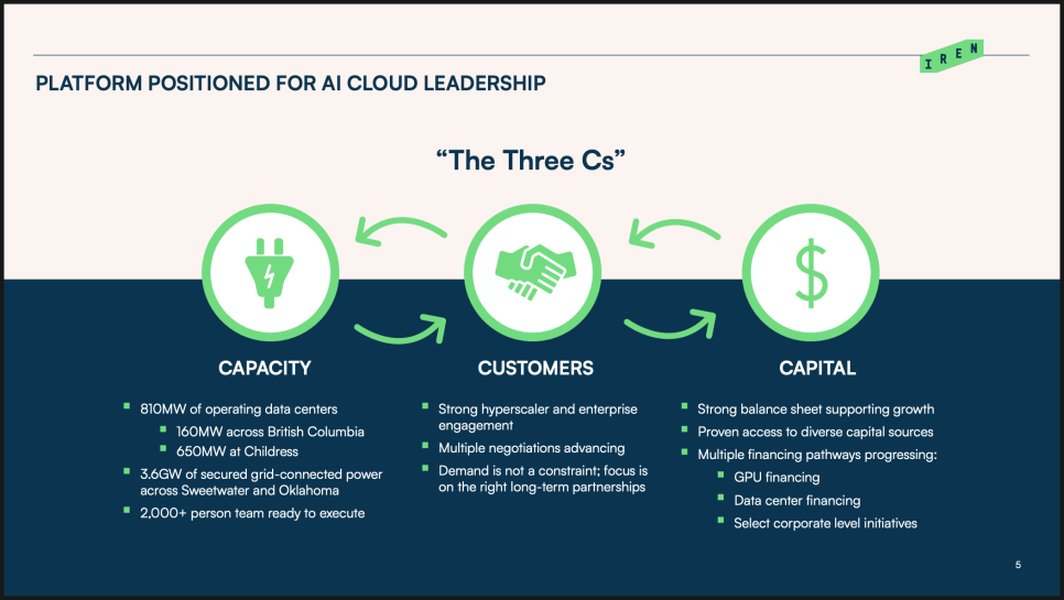 실적 발표 말미에서 CEO는 다시 한 번 핵심 메시지를 정리했습니다. 아이렌은 이미 전력, 데이터센터, 자본 접근성이라는 세 가지 핵심 조건을 모두 갖춘 상태이며, 마이크로소프트 계약과 관련된 대규모 자본 부담을 해소한 지금부터는 더 폭넓은 고객 협상을 실제 계약으로 전환하는 단계에 집중할 수 있다는 점을 강조했습니다. 전력은 제약이 아니며, ERCOT 프로세스는 오히려 실체 있는 프로젝트의 희소성을 부각시키는 역할을 하고 있다고 덧붙였습니다.
