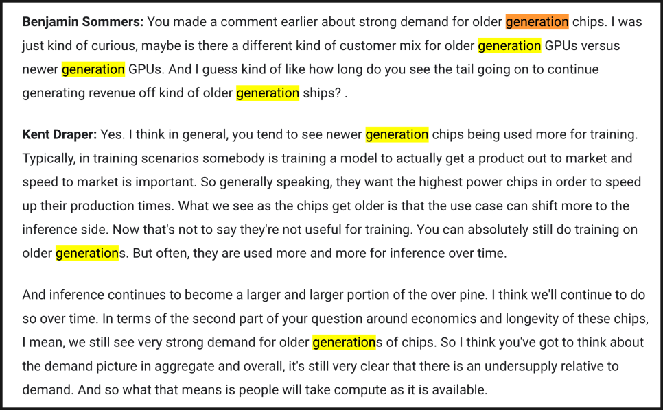 GPU 세대별 수요에 대한 질문도 흥미로웠습니다. 최신 GPU는 주로 AI 모델 학습(training)에 사용되며, 출시 속도가 중요한 고객들이 선호하는 반면, 구형 GPU는 점차 추론(inference) 작업으로 이동하는 경향이 있다고 설명했습니다. 다만 중요한 점은 구형 GPU에 대한 수요 역시 여전히 매우 강하다는 점이었습니다. 업계 전체가 공급 부족 상태에 있기 때문에, 고객들은 사용 가능한 연산 자원을 적극적으로 활용하고 있으며, 실제로 A100이나 V100과 같은 3~5년 된 GPU들도 여전히 거의 100퍼센트 가동률을 유지하며 높은 수익성을 기록하고 있다는 설명이 이어졌습니다.