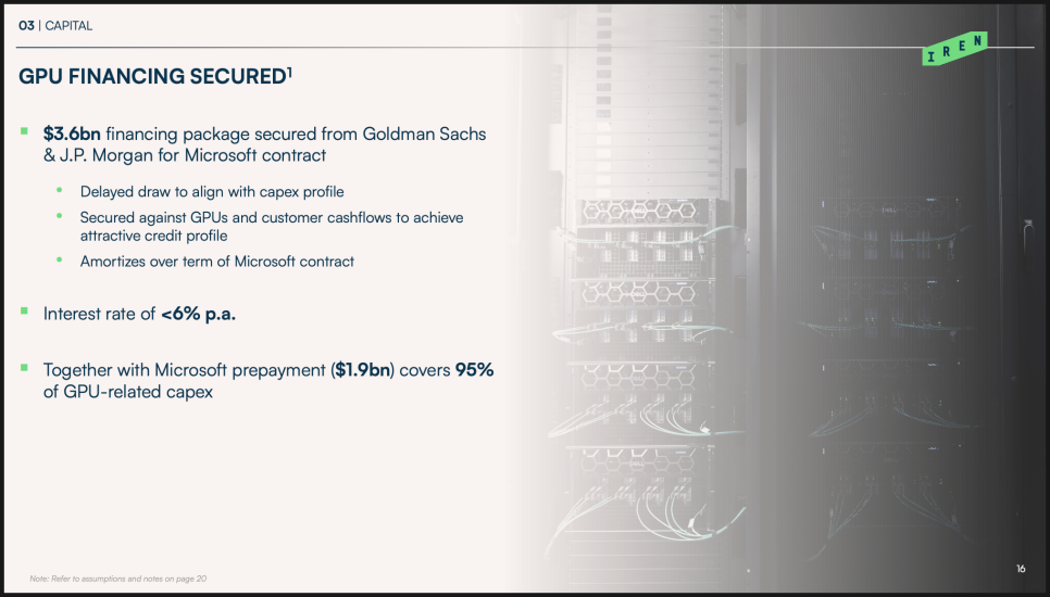 먼저 자본(capital) 측면에서, 마이크로소프트 계약을 위한 36억 달러 규모의 GPU 금융을 연 6퍼센트 미만 금리로 확정했고, 여기에 19억 달러의 마이크로소프트 선급금을 더해 GPU 관련 설비투자의 약 95퍼센트를 커버했다고 밝혔습니다. 평균 이자 비용이 약 3퍼센트 수준이라는 점을 직접 언급한 것도 인상적인데요. AI 클라우드 사업의 가장 큰 부담으로 지적돼 왔던 자본집약도 문제를 상당 부분 해소했다는 점을 시장에 다시 한 번 각인시키기 위한 표현으로 보입니다.