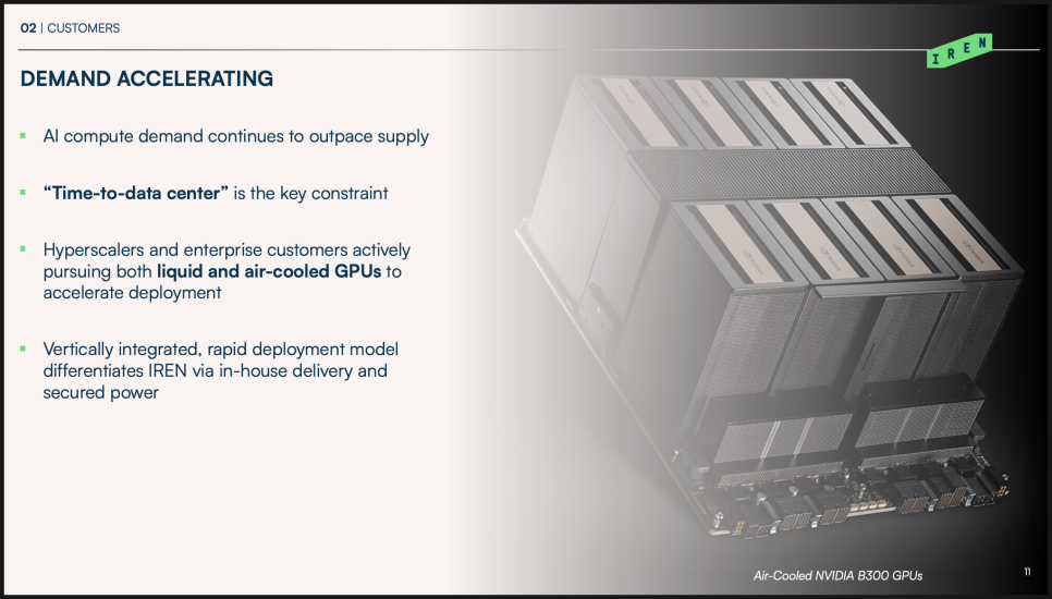 특히 흥미로운 부분은 최근 대형 고객사들과 하이퍼스케일러들이 수랭식보다는 공랭식 GPU에 다시 주목하고 있다는 점입니다. 공랭식 GPU는 설치와 구축 속도가 빠르기 때문에, AI 인프라를 빠르게 확장하려는 고객 입장에서는 매력적인 선택지가 됩니다. 아이렌은 이미 810메가와트 규모의 공랭식 데이터센터를 운영 중이기 때문에, 이 수요 변화가 자사에 매우 유리하게 작용하고 있다고 설명했습니다.