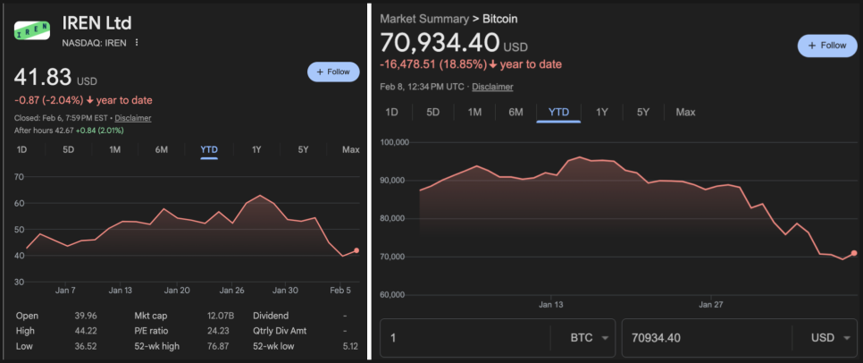 그래서 비트코인 가격이 떨어졌으니까 아이렌도 주가가 떨어졌구나 생각할 수 있지만, 사실 최근 하락장에서 비트코인은 아이렌보다 더 심하게 떨어졌습니다. 오히려 아이렌의 투자 논리는 비트코인을 벗어난지 좀 됐습니다.