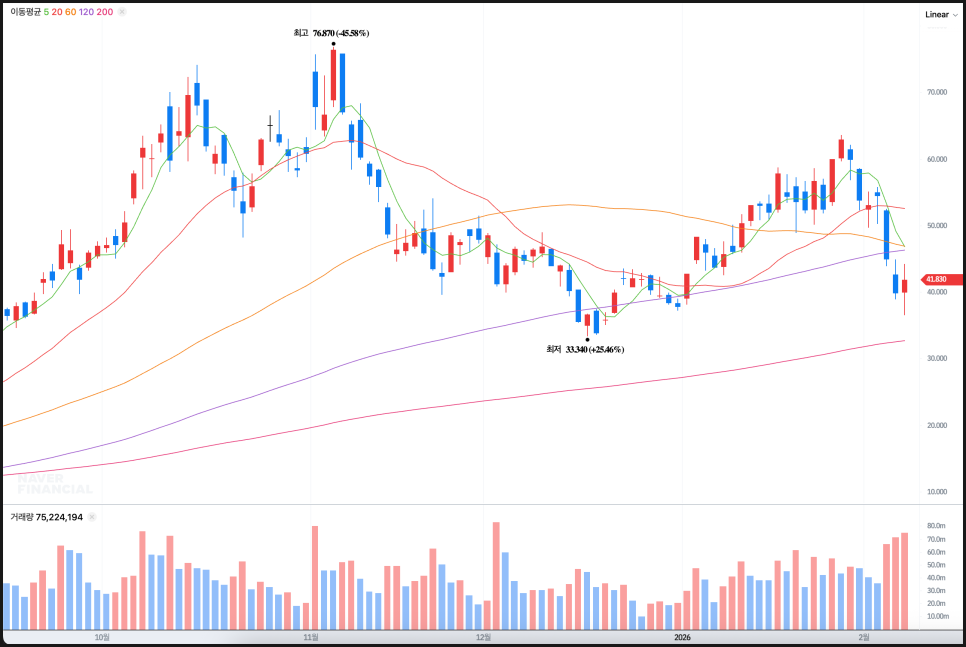일봉으로 내려오면 2025년 12월 중순 이후 주가는 반등 흐름을 만들면서 120일 이동평균선을 지지선처럼 활용해 왔고, 5일선이 60일선과 120일선을 차례로 돌파하는 비교적 건강한 구조를 만들었습니다. 이 구간에서는 추세 전환 기대가 자연스럽게 나올 수 있었습니다. 하지만 최근 급락으로 인해 20일선, 60일선, 120일선을 모두 한 번에 하향 이탈했습니다. 단기적으로는 분명히 추세가 꺾였다는 신호로 해석됩니다. 다시 말해 지금 위치에서는 ‘조정이 끝났는가’를 논하기보다는, 먼저 무너진 이동평균선들을 하나씩 회복하는 과정이 필요해 보입니다.