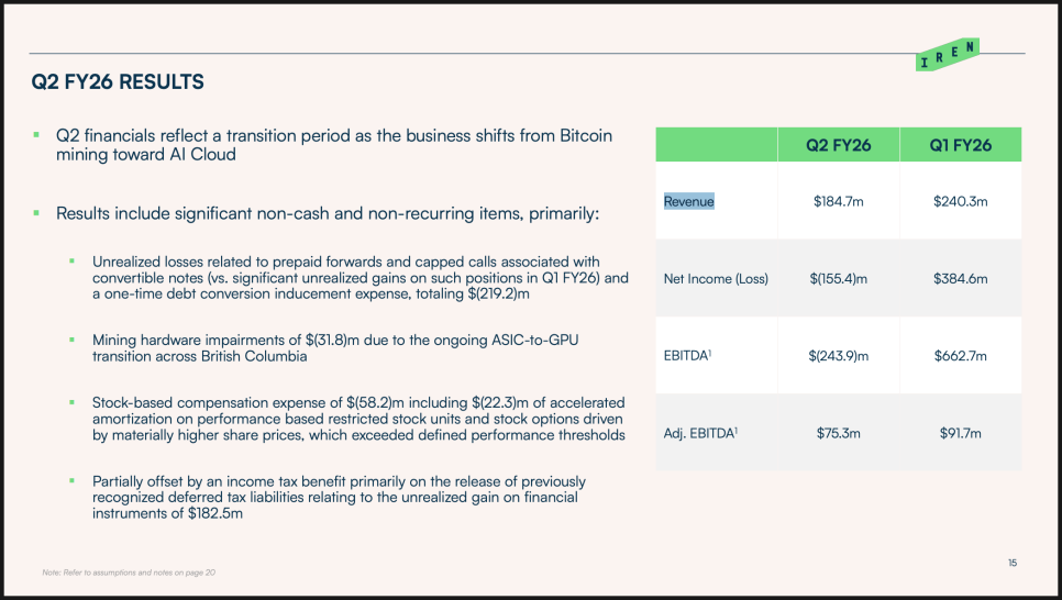 이제 다시 최근 실적 이야기로 돌아가 보겠습니다. 아이렌이 발표한 2026회계연도 2분기 실적을 보면, 매출은 약 1억8천만 달러 수준으로 시장 기대치를 밑돌았고, 순손실은 이전 분기보다 크게 확대됐습니다. 매출 감소의 주요 원인은 여전히 비중이 큰 비트코인 채굴 부문이었는데요. 암호화폐 가격 조정과 함께 채굴 난이도 상승, 운영 비용 부담이 겹치면서 수익성이 악화된 영향이 컸습니다.