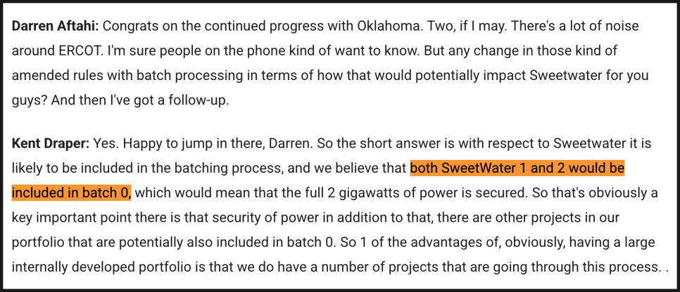 이에 대해 회사는 매우 단호한 태도를 보였습니다. 스위트워터(Sweetwater) 1과 2 프로젝트는 배치 프로세스상 가장 우선순위가 높은 배치 0에 포함될 가능성이 높으며, 무엇보다 이미 2023년에 체결된 전력 연계 계약(interconnection agreement)을 통해 총 2기가와트의 전력은 완전히 확보된 상태라고 명확히 밝혔습니다. 이 전력은 규정 변경이나 시장 잡음과 무관하게 영향을 받지 않으며, 실제로 2026년 2분기 중 스위트워터 1 부지의 전력 인가(energization)가 예정대로 진행되고 있다고 설명했습니다.