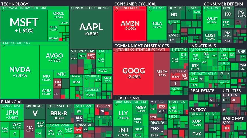 증시 전반의 흐름을 살펴보면 반도체와 대형 기술주들이 시장의 상승을 주도하며 강한 회복 탄력성을 보여주고 있으며 특히 엔비디아와 아브고 같은 주요 AI 하드웨어 기업들이 전반적인 온기를 불어넣고 있습니다. 반면 알파벳이나 아마존 그리고 메타와 같이 플랫폼 및 서비스 중심의 빅테크들은 상대적으로 약세를 보이며 업종 내에서도 뚜렷한 차별화 장세가 연출되고 있는 점이 특징입니다. 금융주인 JP모건과 헬스케어의 일라이릴리 등 가치주 성격의 종목들도 견조한 흐름을 유지하며 포트폴리오의 안정성을 지지하고 있지만 에너지와 일부 소비재 분야에서는 조정이 이어지며 시장의 에너지가 특정 테마에 쏠려 있음을 시사하고 있습니다. 다우 지수가 5만 선을 돌파하며 역사적인 이정표를 세운 것은 고무적이지만 기술주 내에서의 쏠림 현상은 여전히 주의 깊게 살펴야 할 대목입니다.