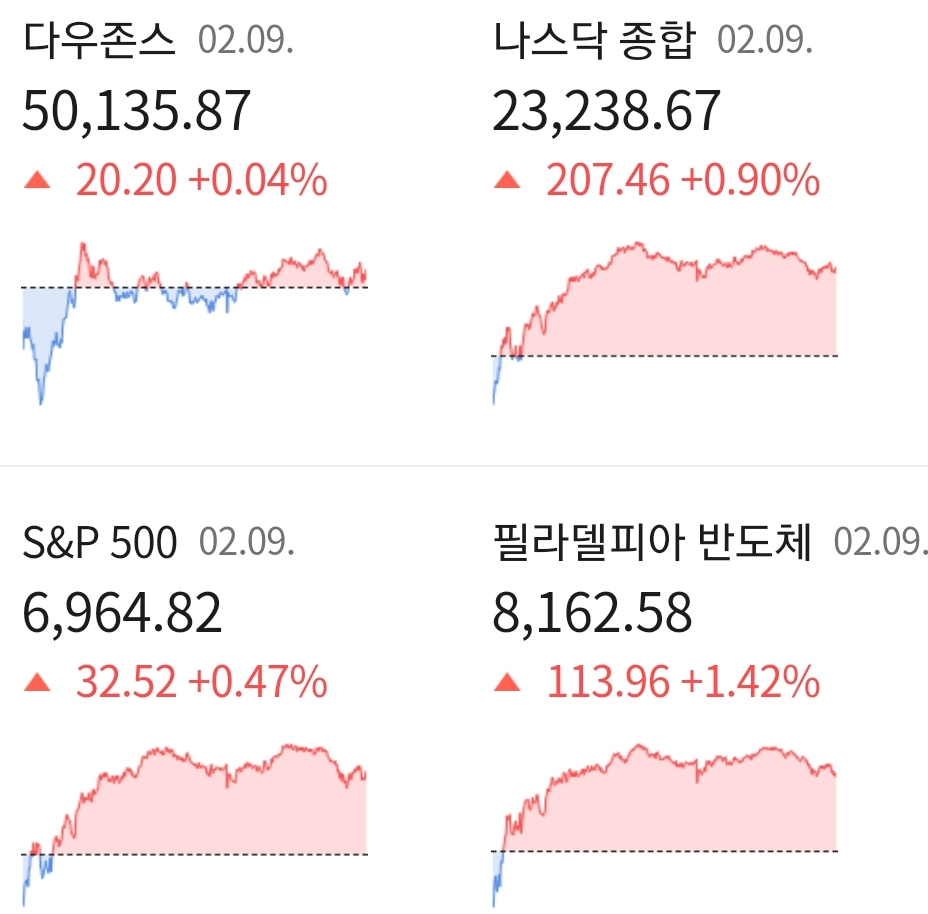 다우지수는 전일 대비 +0.04% 상승한 50,135.87에 거래를 마쳤으며, 대형주 중심의 S&P500 지수는 전장 대비 +0.47% 오른 6,964.82에 장을 마감하였습니다. 기술주 중심의 나스닥 지수는 전 거래일 대비 +0.90% 상승한 23,238.67에 거래를 마치며 장을 마감하였습니다.