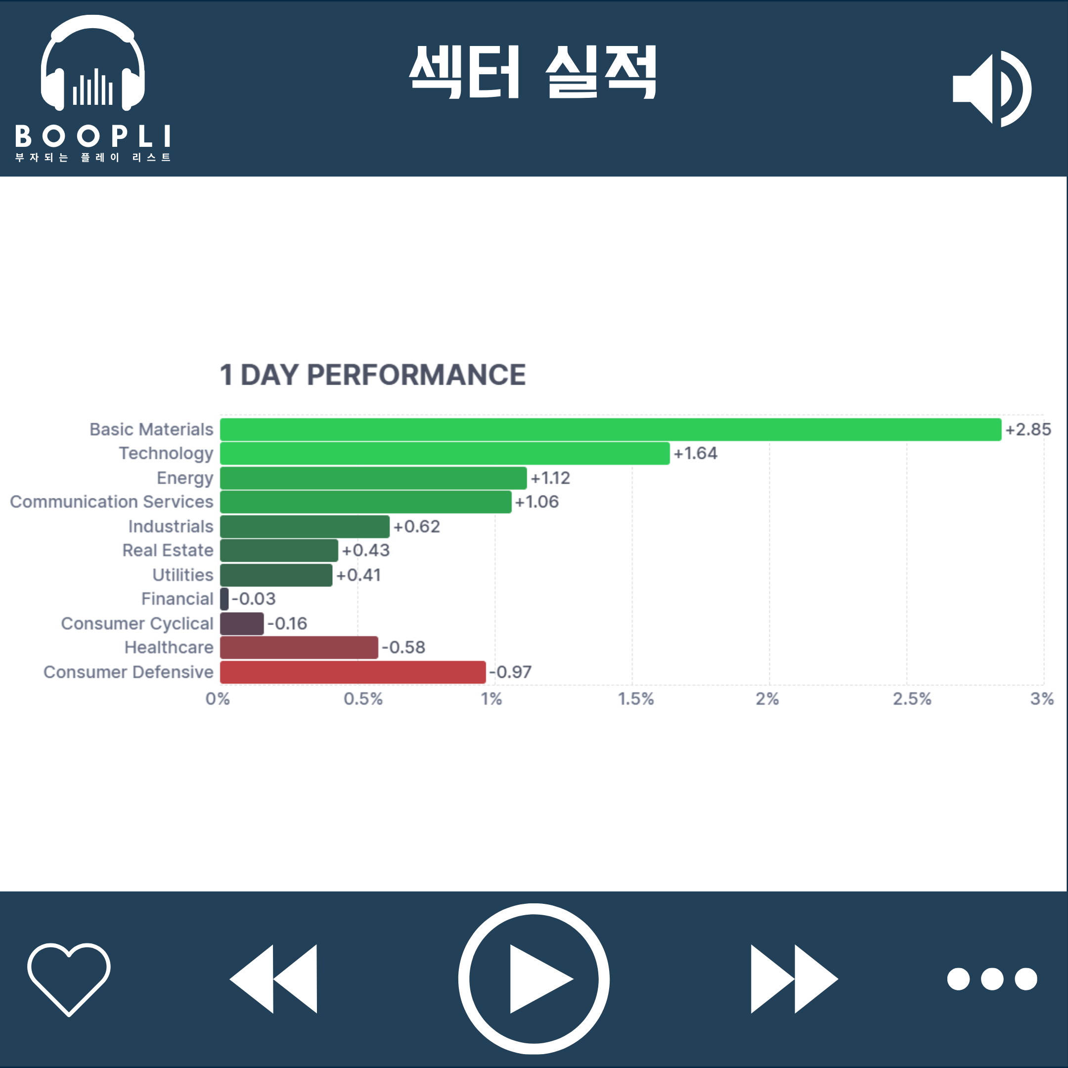 국채 금리 하락과 달러 약세 속에서 원자재 섹터가 상승을 주도했고, 이어서 기술, 에너지, 커뮤니케이션 서비스, 산업재 순으로 강세