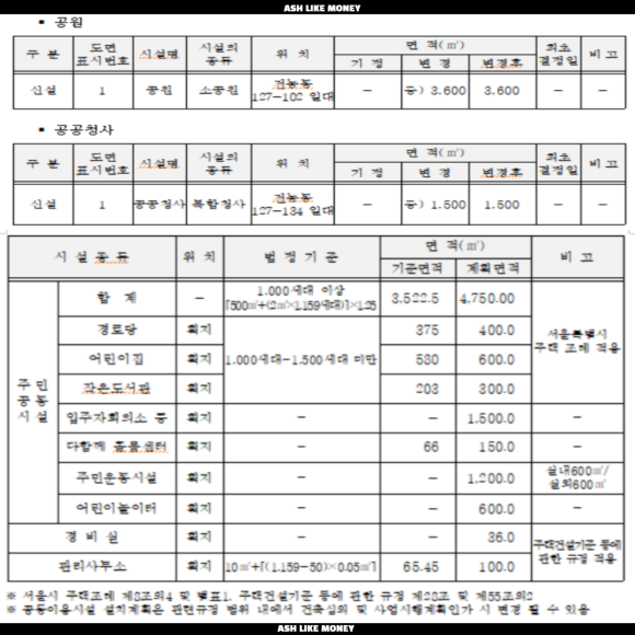 공원, 도로, 공공청사 등 정비기반시설 면적은 3,888평이고 공원 하부에는 부족한 주차수요를 보완하기 위해 주차장을 설치한다. 주민공동시설로는 경로당, 어린이집, 도서관, 운동시설, 북카페, 헬스장 등이 설치될 예정이다. 신축쪼개기로 인해 소유자가 늘어난 전농9구역은 21년 8월 합의서를 통해 최소분양면적을 15.7㎡(4.75평)를 기준으로 정리되었고 1~3순위 차등기준을 마련하여 공정성과 사업성을 확보하였다.
