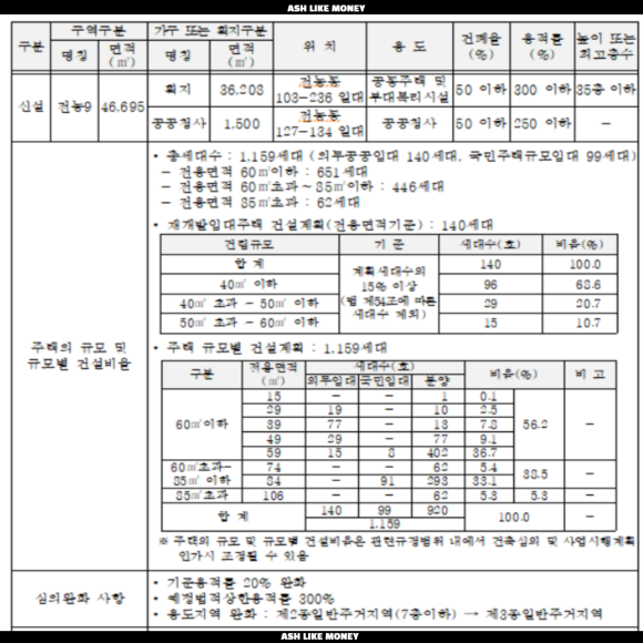 전농9구역은 사업시행계획 통합심의를 거쳐 용적률 체계변경, 사업성 보정계수 적용, 임대 및 분양 세대 구성, 공동이용시설 및 기반시설 계획을 새로 반영하였다. 제3종일반주거지역의 용도지역은 그대로 두되 허용용적률을 243%, 정비계획용적률을 270%, 최종 용적률을 299.89%로 변경하였다. 최고층부에는 철도변 39층, 동측 도로변에 20~29층으로 차등배치하였다.