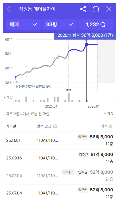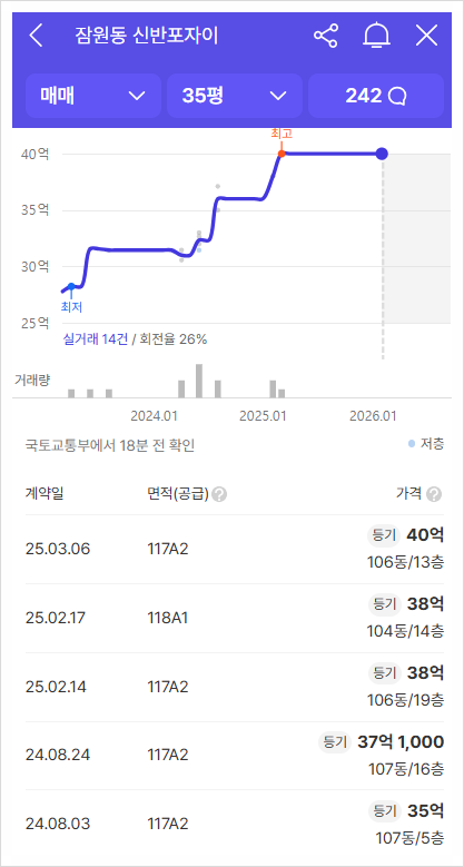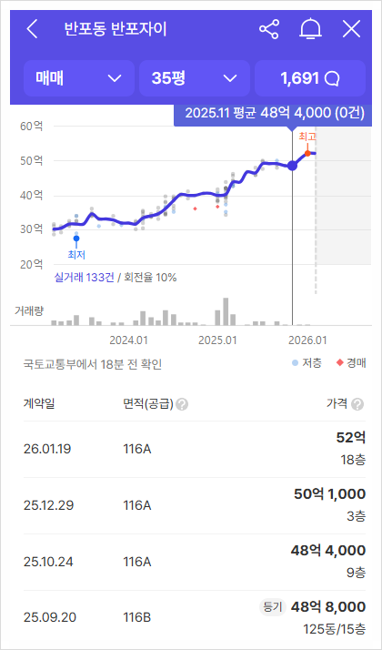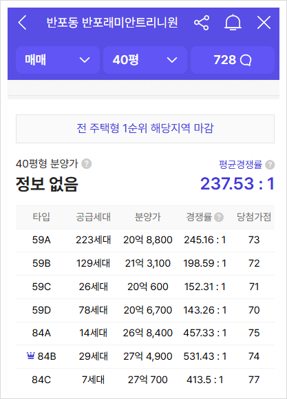 15억 미만 아파트는 대출 6억 한도, 15억 이상 25억 미만은 대출 한도 4억, 25억 초과 아파트는 대출 한도 2억이라 진짜 돈 많은 현금부자가 아니라면 청약시도조차 불가능한 그야말로 로또청약이다. 근처 아파트들을 보면 메이플자이, 래미안 원베일리, 반포자이, 반포센트럴자이, 반포리체, 래미안퍼스티지, 반포래미안아이파크 등 40억~60억까지 가는 아파트이기에, 당첨만 되면 시세차익 20억 이상은 확보하는 셈이다.