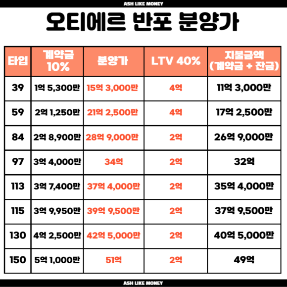 분양가상한제가 적용되기에 로또분양이다. 이는 반포래미안트리니원을 참고하여 예상분양가를 책정해보았다. 현재 반포래미안트리니원은 25평 분양가가 20억으로 평당 1억은 아니라 7,900~8,300만원 수준이다. 그래서 오티에르 반포 역시 분양가를 반포래미안트리니원 수준으로 계산했는데, 이보다 조금 더 올려 평당 8,500만원으로 계산했다.