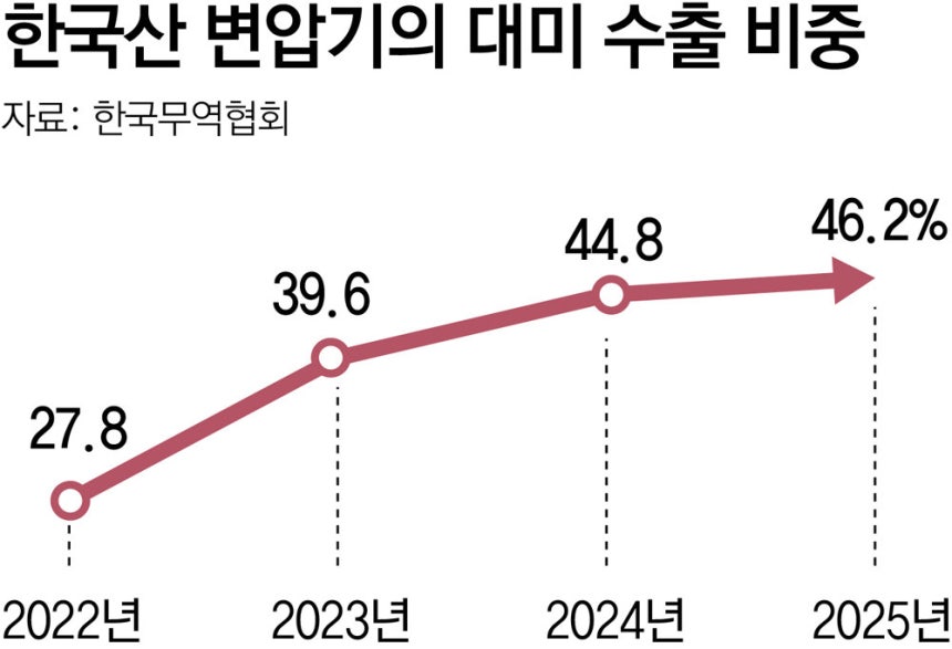 한국무역협회에 따르면 한국산 변압기의 대미 수출 비중은 2022년 27.8%에서 지난해 46.2%로 뛰었음