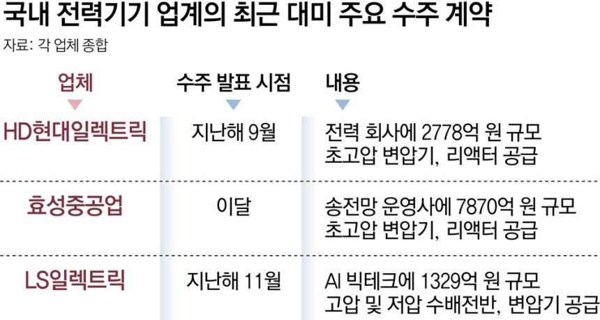 미국발 슈퍼사이클로 전력기기 주문이 폭주해 이미 HD현대일렉트릭·효성중공업·LS일렉트릭 등 국내 톱3 전력기기 업체는 3, 4년 치 일감을 확보한 상황(합산 수주 잔액 총 27조 원)