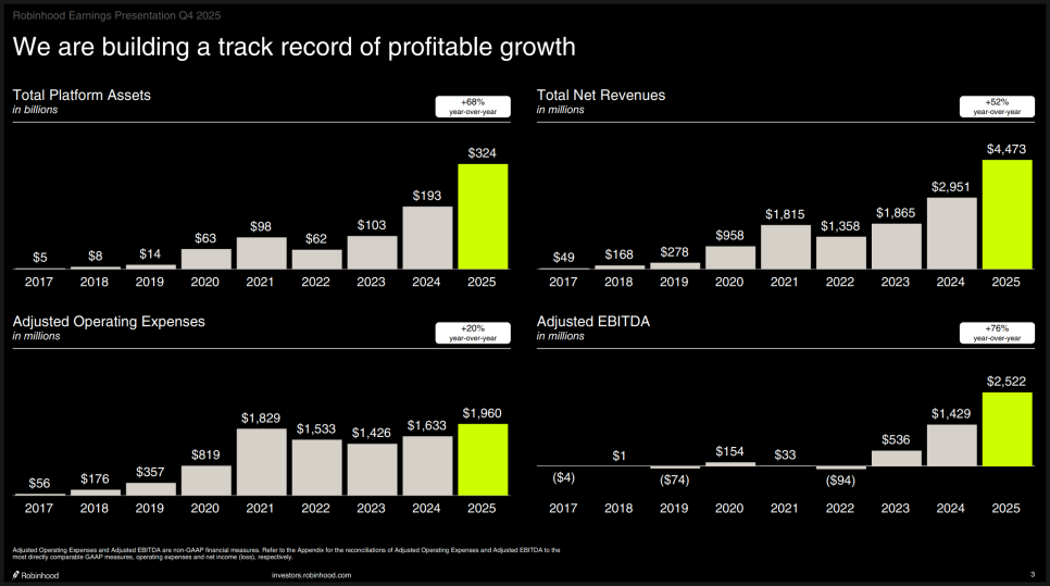 먼저 블라드 테네프(Vladimir Tenev) CEO는 2025년을 “기록적인 해”라고 규정했습니다. 연간 매출은 45억 달러로 전년 대비 52% 증가했고, 조정 EBITDA는 25억 달러로 76% 늘어났습니다. 조정 EBITDA 마진이 56%까지 올라왔다는 점도 인상적입니다. 단순히 성장만 하는 것이 아니라, 이익률까지 함께 개선되고 있다는 것이죠.