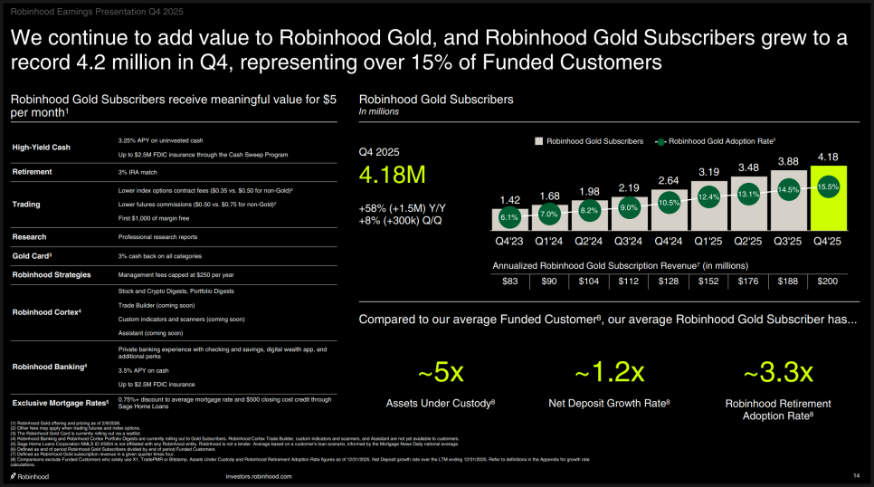 로빈후드 골드 카드(Robinhood Gold Card) 같은 경우 2025년 한 해 동안 가입자가 5배 이상 늘어 60만 명을 넘었고, 연간 환산 결제액은 100억 달러를 돌파했습니다. 회사는 올해 말까지 골드 카드 고객을 100만 명 이상으로 두 배 이상 확대하겠다는 계획입니다. 단순한 거래 플랫폼을 넘어 소비·결제 영역까지 파고들고 있다는 점에서 전략적 의미가 있습니다.