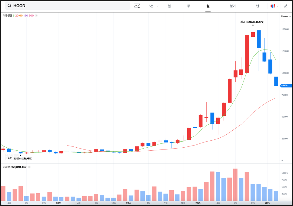 그런데 로빈후드 주가는 현재 고점 대비 40% 이상 하락한 상태입니다. 작년에 가장 많이 오른 미국 주식 중에 하나였는데, 조정 폭도 어마어마합니다.