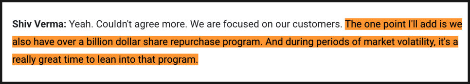여기에 더해 CFO 쉬브 버마(Shiv Verma)는 현재 10억 달러 규모의 자사주 매입 프로그램도 보유하고 있으며, 변동성이 클 때 이를 적극 활용할 수 있다고 덧붙였습니다.