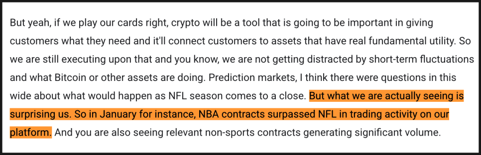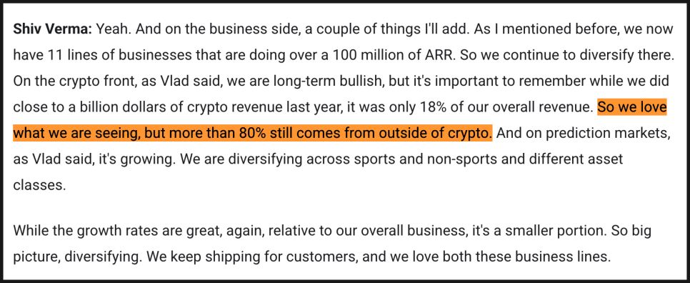 참고로 암호화폐 둔화와 스포츠 시즌 종료 이후 예측시장 성장 둔화 우려에 대해서는 비교적 자신감 있는 답변이 나왔습니다. 암호화폐는 단순한 자산군이 아니라 미래 금융 인프라의 기반 기술이라는 관점에서 접근하고 있으며, 토큰화(tokenization)와 스테이블코인 파트너십을 통해 전통 금융과 점차 결합될 것이라는 장기 비전을 다시 강조했습니다. 실제로 2025년 암호화폐 매출은 약 10억 달러에 달했지만, 전체 매출의 18% 수준에 불과하다는 점을 CFO가 언급했습니다. 즉, 80% 이상은 이미 비암호화폐 영역에서 발생하고 있어 구조적으로 과도하게 의존하는 상태는 아니라는 설명입니다.