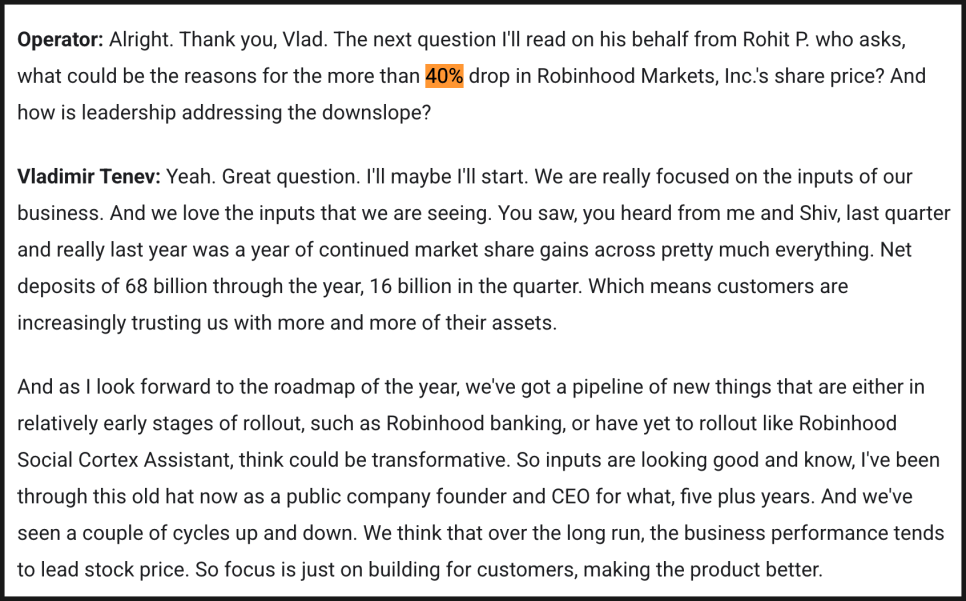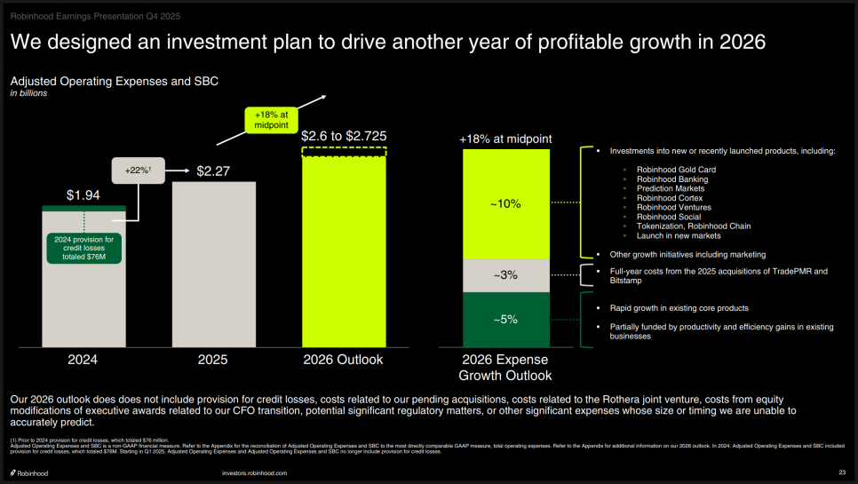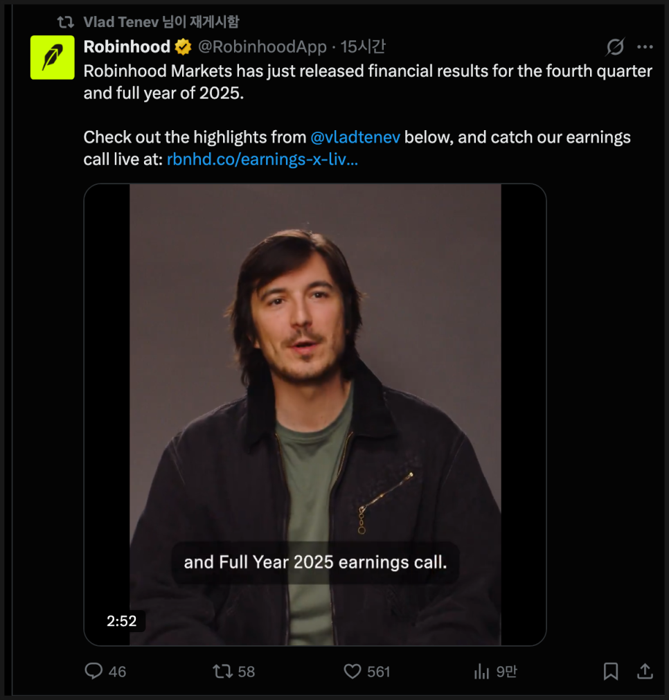 정리해 보면, 로빈후드는 트레이딩 중심 플랫폼에서 예측시장, 카드, 뱅킹, 사모시장, 토큰화, AI까지 포괄하는 금융 슈퍼앱으로 빠르게 확장하고 있으며, 그 과정에서 자산 유입과 수익성 개선이 동시에 나타나고 있다는 점이 가장 중요합니다. 게다가 2026년도 공격적인 실행의 해가 될 것이라는 점을 경영진이 분명히 했죠.