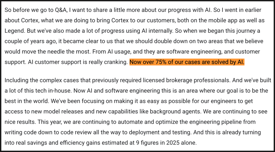 AI 활용도 매우 중요한 메시지였습니다. 현재 고객 문의의 75% 이상을 AI가 해결하고 있으며, 과거에는 자격을 갖춘 브로커가 처리하던 복잡한 케이스도 포함된다고 밝혔습니다. 내부 소프트웨어 개발 과정에도 AI를 적극 도입해 2025년에만 9자리 수(억 달러 단위)의 비용 절감 효과를 냈다고 설명했습니다. 높은 제품 출시 속도(product velocity)를 유지하면서도 비용을 통제할 수 있었던 배경으로 AI를 명확히 제시했습니다.