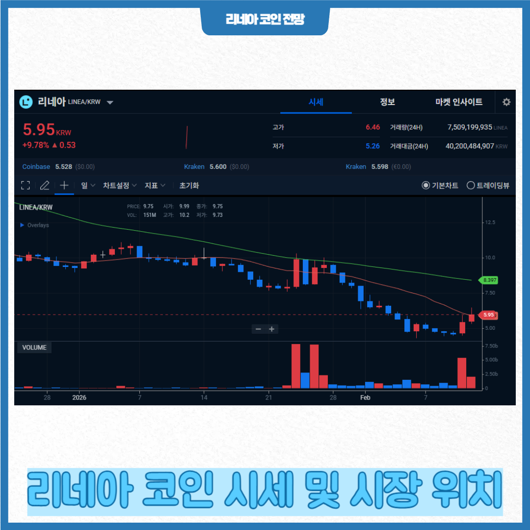 2026년 기준 리네아의 가격은 약 4.88원대 수준에서 움직이고 있으며, 거래량과 시총 데이터가 활발하게 변화하고 있습니다. 시장 순위는 주요 암호화폐 중 약 360위권에 위치합니다.