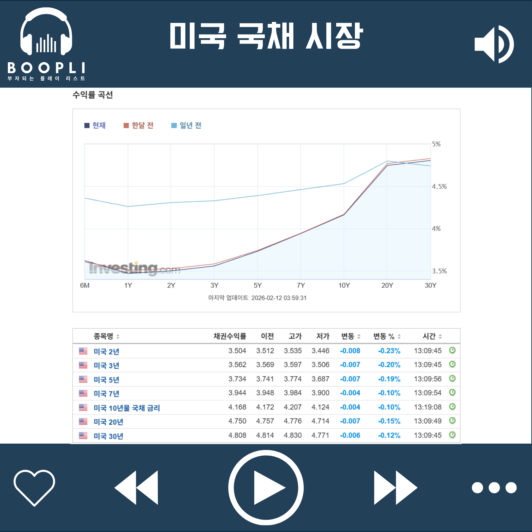 미국 국채는 1월 고용보고서가 예상보다 강했고, 미 의회 예산국(CBO)의 재정 적자 확대 경고, 제프 슈미드 캔자스시티 연은 총재의 매파 발언, 10년물 국채 입찰 수요 부진이 겹치며 장단기 금리 모두 상승