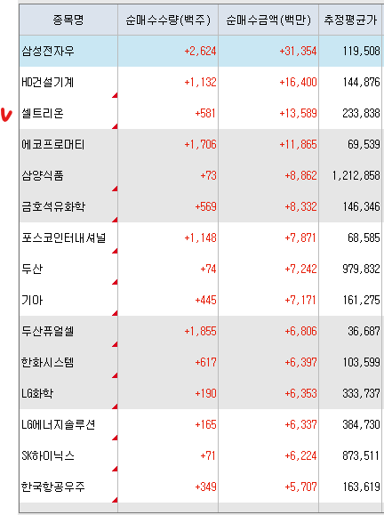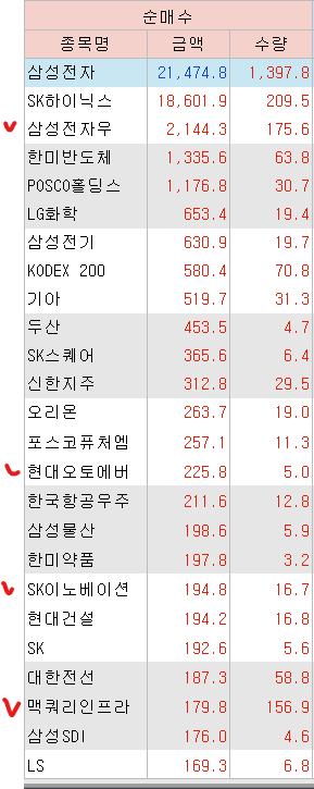 외국인은 KOSPI를 4거래일 연속 순매수. 특히 오늘은 +3조1,919억 원의 역대급 순매수 단행. 전기/전자와 화학 업종을 매수했고, 금융과 운송장비/부품 업종을 매도. 기관도 KOSPI를 1.4조 원 순매수