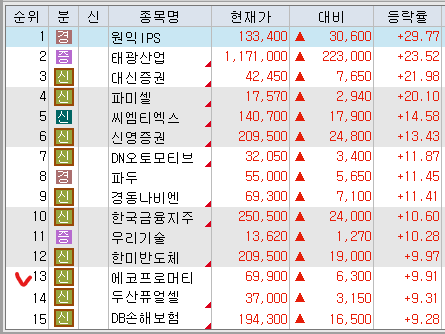 3차 상업개정 기대감, 호실적과 주주 환원 기대에 금융주가 강세(대신증권 +21.98%, 한국금융지주 +10.60%, 신한지주 +7.83%, BNK금융지주 +7.65%, 기업은행 +6.80%, iM금융지주 +5.94%, 우리금융지주 +5.81%, 미래에셋증권 +5.07%)