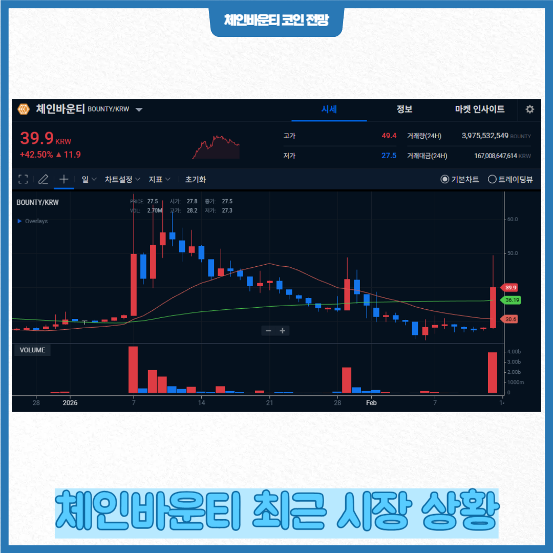 체인바운티는 국내 주요 거래소인 업비트, 빗썸, 코인원 등에 상장되어 있으며, 특히 국내 투자자 중심의 거래량이 활발합니다. 최근 몇 주간 상승세가 이어지며 거래량도 늘어나는 모습을 보였습니다.