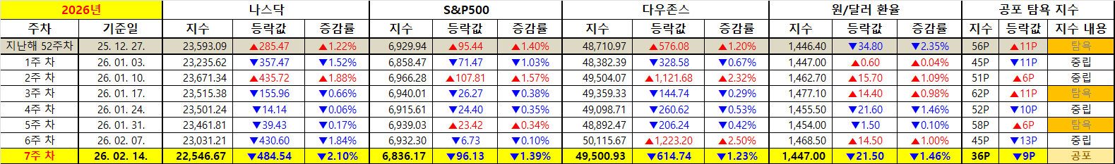 시장이 '공포' 단계에 들어서고 지수가 연일 하락할 때는 누구나 심리적으로 위축될 수밖에 없으나 이럴 때일수록 본인만의 투자 원칙을 되새겨야 합니다. 저는 이번 하락장을 자산 구성의 리스크를 점검하는 계기로 활용하고 있으며 급격한 매도보다는 계획된 적립식 매수를 이어가며 장기적인 관점을 유지하려 노력하고 있습니다. 주 후반에 발표될 미국의 핵심 경제 지표들이 시장의 우려를 씻어내는 긍정적인 데이터로 나타나기를 희망하며 이웃 여러분들도 변동성에 휘둘리지 않는 평온한 투자 이어가시길 바랍니다. 다음 주에는 설 연휴가 있는 만큼 가족들과 행복한 시간 보내시면서 재충전하는 한 주가 되셨으면 좋겠네요. 저 역시 시장의 흐름을 놓치지 않고 꼼꼼히 체크하며 여러분께 유익한 정보를 전달해 드릴 수 있도록 준비하겠습니다.