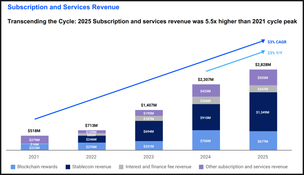 구체적인 수치를 보면, 2025년 총 거래량은 5조 2천억 달러에 달해 전년 대비 156% 증가했습니다. 암호화폐 거래 시장 점유율은 6.4%로, 전년 대비 두 배 이상 확대되었습니다. 구독 및 서비스 매출은 28억 달러로, 2021년 강세장 정점 대비 5.5배 증가했습니다. 코인베이스 제품 내 평균 USDC 잔고는 178억 달러에 달했고, 평균 USDC 시가총액은 762억 달러를 기록했습니다. 코인베이스 원 유료 구독자는 3년 만에 세 배 이상 늘어나 거의 100만 명에 도달했습니다.