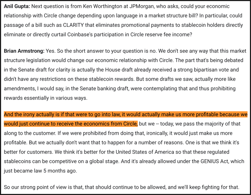 일부 초안에서 스테이블코인 보상 프로그램을 제한할 가능성이 거론되었는데, 이에 대해 암스트롱은 그런 규제가 오히려 코인베이스 수익성을 높일 수 있다고 설명했습니다. 현재 코인베이스는 서클(Circle)로부터 받는 준비금 수익의 상당 부분을 고객에게 돌려주고 있는데, 만약 보상이 금지되면 그 이익이 회사에 남게 된다는 논리입니다. 그러나 그는 그런 방향을 원하지 않는다고 분명히 했습니다. 고객과 미국 내 규제된 스테이블코인이 글로벌 경쟁력을 유지하려면 보상 구조가 유지되어야 한다는 입장입니다. 중국 중앙은행 디지털화폐처럼 이자를 지급하는 구조와 경쟁해야 한다는 점도 언급했습니다. 그러니까 단순한 수익 문제가 아니라, 미국 달러 기반 스테이블코인의 글로벌 입지를 지키는 전략적 문제로 보고 있다는 의미입니다.