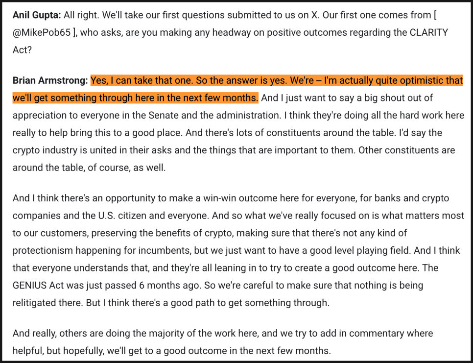 먼저 규제 관련 질문에서 브라이언 암스트롱(Brian Armstrong) 최고경영자는 ‘클래리티 법안'에 대해 낙관적인 태도를 보였습니다. 그는 향후 몇 달 안에 긍정적인 결과가 나올 가능성이 높다고 보며, 상원과 행정부가 적극적으로 움직이고 있다고 평가했습니다. 중요한 부분은 이 법안이 특정 이해관계자를 보호하는 방향이 아니라, 암호화폐 기업과 은행, 그리고 미국 시민 모두에게 ‘공정한 경쟁 환경’을 제공하는 방향으로 가야 한다는 점인데요. 이미 지니어스 법안(GENIUS Act)이 통과된 상황에서 기존 합의를 다시 뒤집는 일은 없어야 한다는 입장도 명확히 했습니다.