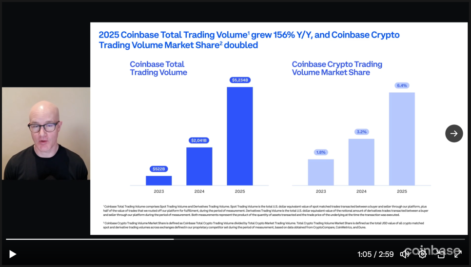 우선 이번 실적 발표에서 코인베이스는 여러 핵심 지표에서 사상 최고치를 기록했다고 밝혔습니다. 특히 2025년 한 해 동안 총 거래량과 암호화폐 거래 시장 점유율이 두 배 이상 확대되었고, 구독 및 서비스 매출 역시 역대 최고 수준을 달성했다는 점이 강조되었습니다.