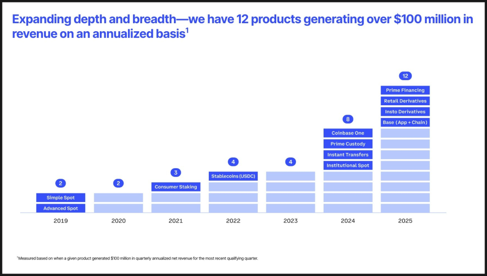 코인베이스가 왜 2026년에 유리한 위치에 있다고 보는지도 몇 가지로 정리했습니다. 첫째, 전 세계 암호화폐의 약 12%를 보관하고 있으며, 이는 상위 네 개 경쟁사를 합친 것보다 많다는 점입니다. 자산 보관 규모가 크다는 것은 고객 신뢰와 네트워크 효과 측면에서 강력한 진입장벽을 의미하죠. 둘째, 글로벌 거래량과 시장 점유율이 전년 대비 두 배로 증가했다는 점입니다. 셋째, 연간 1억 달러 이상의 매출을 내는 제품이 12개에 달하고, 그중 절반은 2억5천만 달러 이상 규모로 성장하고 있다는 점입니다.