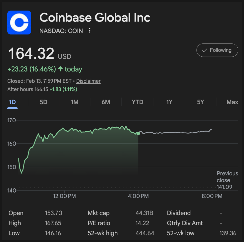 한편 실적 발표 후 거래일에서 코인베이스 주가는 16% 이상 급등을 했습니다. 실적 내용이 놀라울 것도 없었는데, 이미 주가가 떨어질 대로 떨어져서 데드캣 바운스를 한 것일까요?