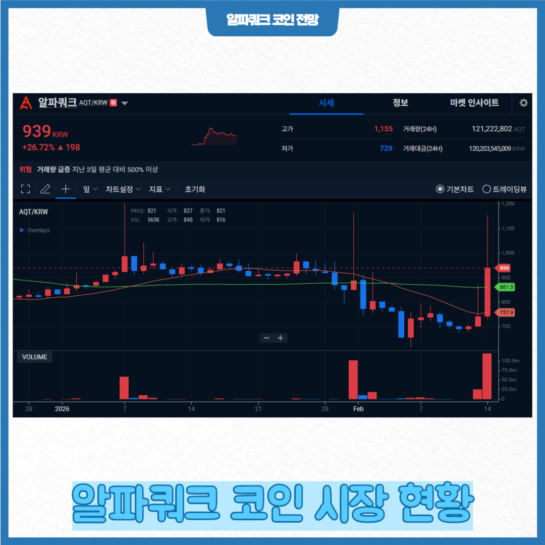2026년 2월 중순 기준으로 알파쿼크 코인 1 AQT 가격은 약 ₩740~₩870대 수준에서 변동 중입니다.
