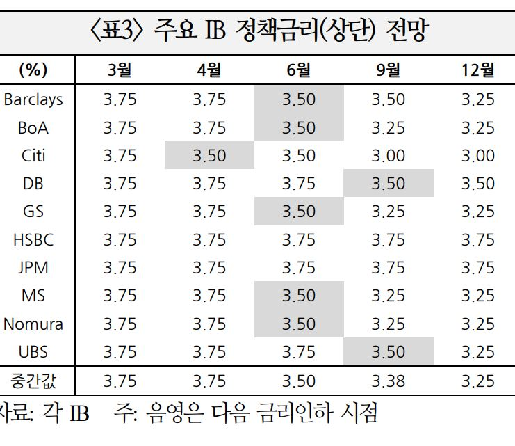 ※ 주요 IB 중 5월 이후 금리인하 재개 전망 10곳 중 7곳, 5월 전 금리인하 재개 1곳, 연내 동결 2곳