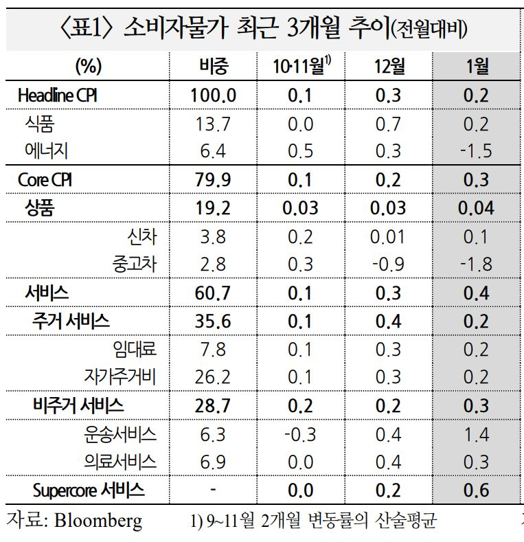 - 한편 일각에서는 연초 가격조정 및 잔여 계절성(근원 서비스 부문에서 두드러지게 나타나는 경향), 임금상승률 완화 등을 감안하면 1월 상승세의 지속 가능성은 낮다고 평가(BofA)