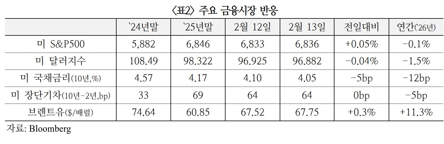 ㅇ 미국 주가는 우호적인 1월 CPI 보고서에도 AI가 경제전반에 미칠 영향에 대한 불확실성이 이어지며 강보합 마감(S&P500 0.05%, 다우30 0.1%, 나스닥 -0.2%)