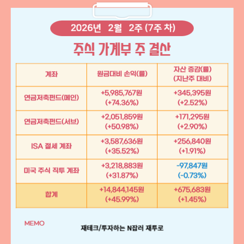 어느덧 2026년의 7주 차를 맞이하여 한 주 동안의 주식 가계부를 결산하며 스스로의 투자 원칙을 되돌아보는 시간을 가지려 합니다.
