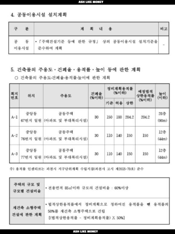 정비기반시설은 6,038평이고 도로, 공원, 수도설비, 하천 등이 포함된다. 임대주택 비율은 아직 발표되지 않았지만 약 15%로 가정하면 7,578평이다. 총 연면적이 50,521평이고 기존 용적률이 100%이므로 기존 연면적은 30,939평, 임대주택 면적 7,578평, 상가 면적 1,000평을 가정하면 일반분양 면적은 11,004평이다.